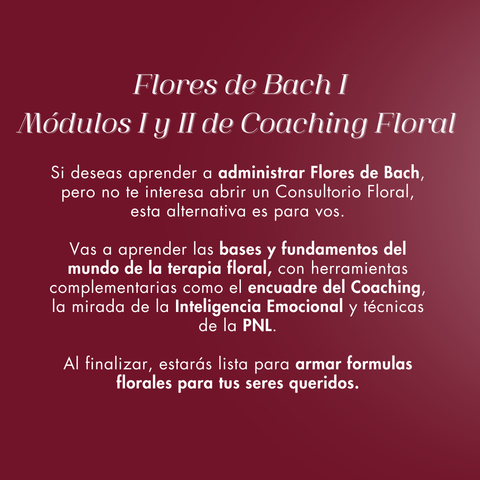 Vas a conocer las bases y fundamentos del mundo de la terapia floral, sumando herramientas para tu dìa a dia, como el encuadre y preguntas poderosas del Coaching, con posibilidad de comprender las emociones desde la técnica de inteligencia emocional, más práticas para tu día a día desde la PNL.