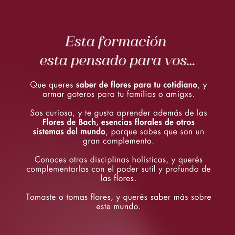 Si sos Terapeuta de otras disciplinas vas a aprender sobre el sistema de Flores de Bach y otras flores del mundo, para poder sumar a tu práctica esta maravillosa herramienta, diseñando formulas personalizadas para tus consultantes.